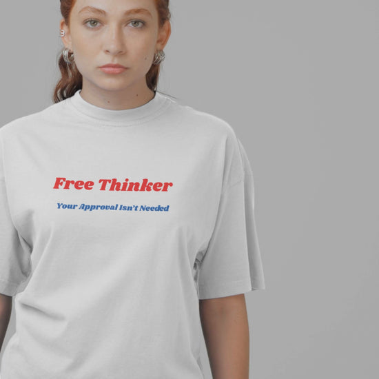 Lightweight and straightforward, this tee speaks quietly but with confidence. A clean white shirt bears a simple two-line statement in bold red and navy: “Free Thinker” above a smaller, wry secondary line.